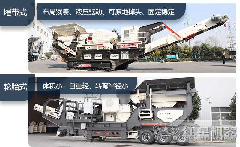 移動式軋石機可分為履帶式移動破碎機和輪胎式移動破碎機兩種形式的驅動方式。