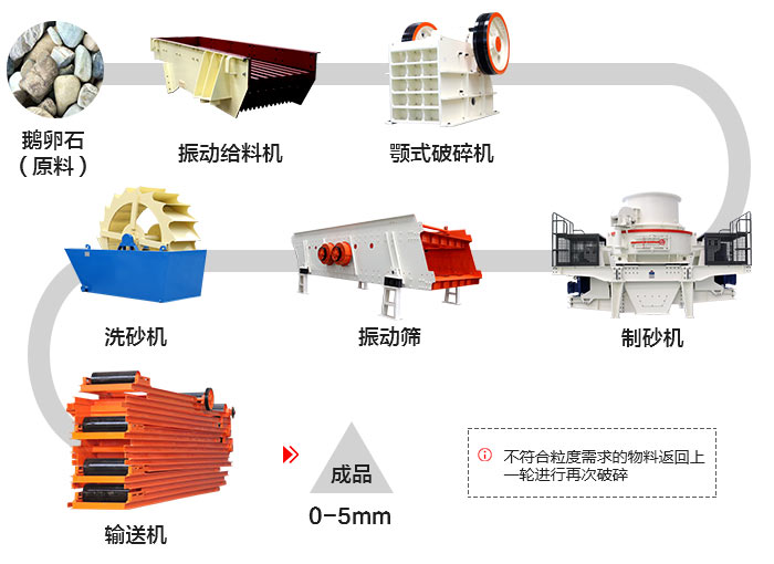 大塊的鵝卵石需要粗碎后才可以進(jìn)入細(xì)碎機(jī)進(jìn)行細(xì)碎,細(xì)碎粒度合適的鵝卵石被送入制砂機(jī)進(jìn)行細(xì)碎加工,制砂后的鵝卵石由圓振篩進(jìn)行篩分,較大粒級(jí)鵝卵石返送至制砂機(jī)再次破碎,符合需求的則由皮帶機(jī)送至儲(chǔ)料堆貯存制成鵝卵石砂子的物料被送入洗砂機(jī)清洗,清洗后,作為最終產(chǎn)品的一部分,由皮帶機(jī)傳送至儲(chǔ)料堆進(jìn)行包裝